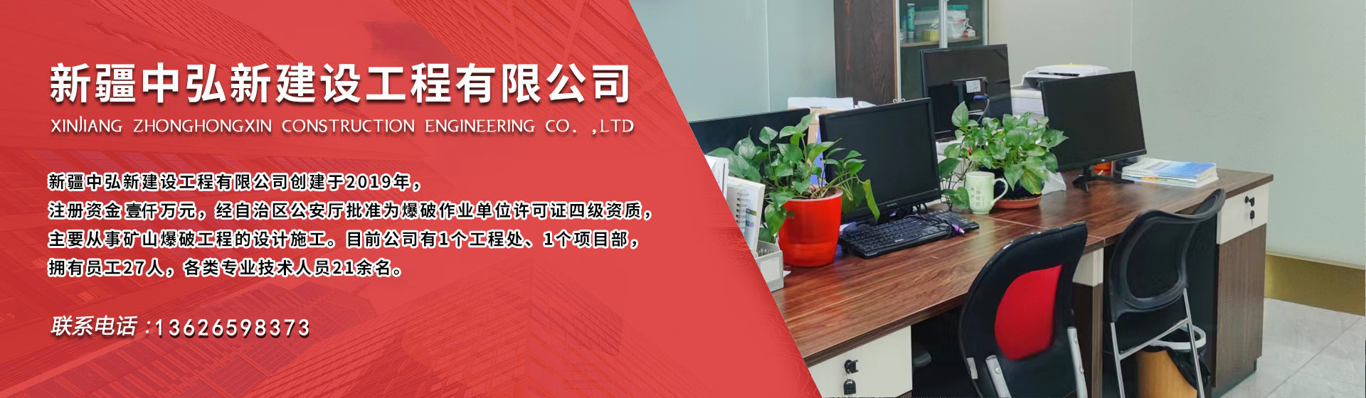 ZHONGHONGXIN CONSTRUCTION ENGINEERING   公 司 簡 介新疆中弘新建設(shè)工程有限公司創(chuàng)建于2019年,注冊資金壹仟萬元,經(jīng)自治區(qū)公安廳批準為爆破作業(yè)單位許可證四級資質(zhì),主要從事礦山爆破工程的設(shè)計施工、礦上采掘施工業(yè)務(wù)。目前公司有1個工程處、2個項目部,分...